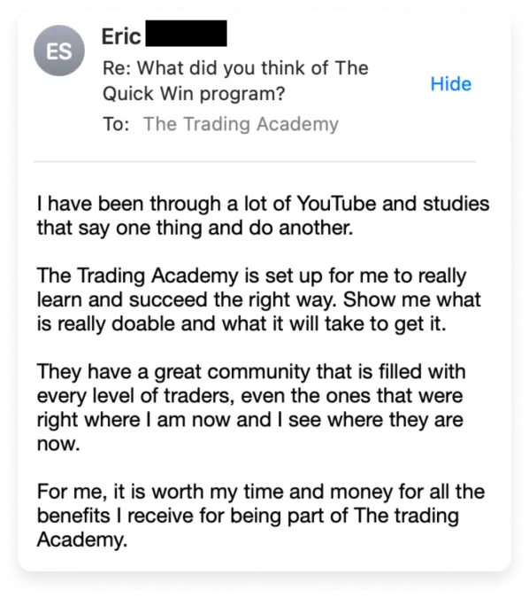 This is a 28 day, cohort-based training experience that provides you access to support, accountability and structure that is scientifically proven to teach you how to trade a strategy with success.
